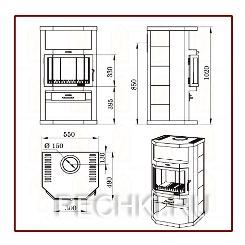 Диаметр дымохода - 150 мм Высота - 1010 мм Ширина - 560 мм Глубина - 510